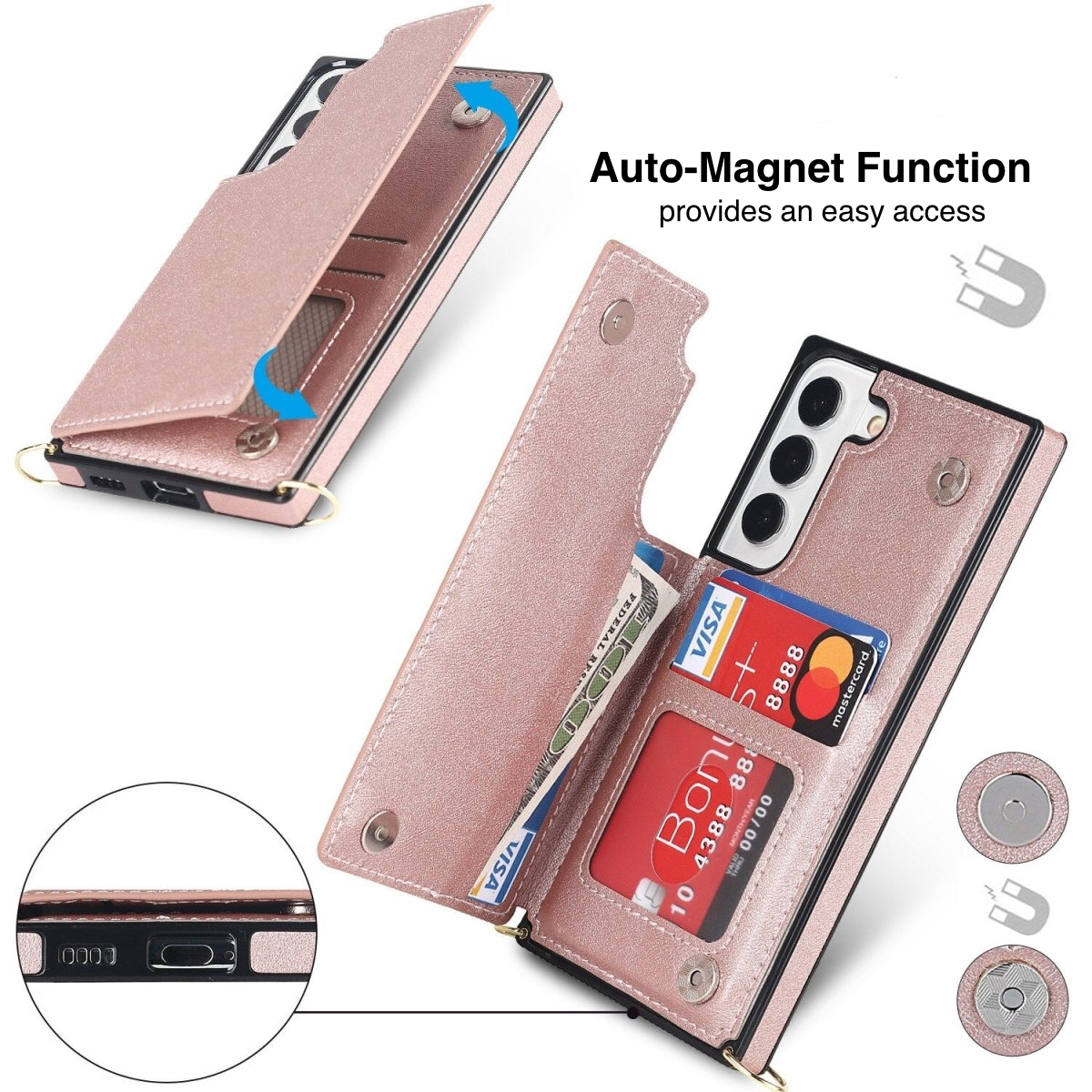 • Comes with a flap that reveals card slots for cards, cash, and photos